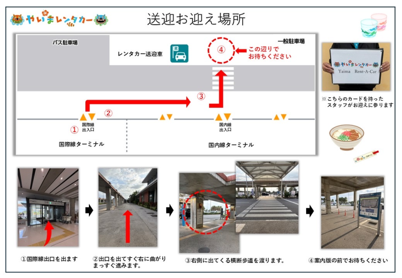 横断歩道を渡った先で「やいまレンタカー」の看板を持ったスタッフがお待ちしております。スタッフと合流しましたら送迎車へご案内致します。